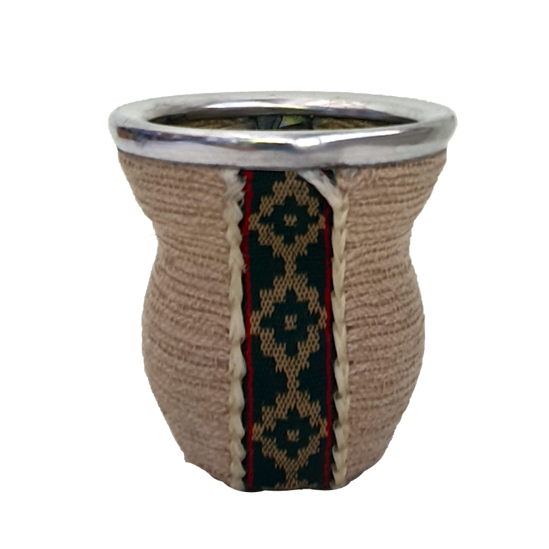 Wunderschönes Glasmate, mit Stoff und einem Zierband mit Pampa-Muster umgezogen. Ein Aluminiumring umgibt die breite Öffnung des Mates. Verschiedene Farben zur Auswahl.