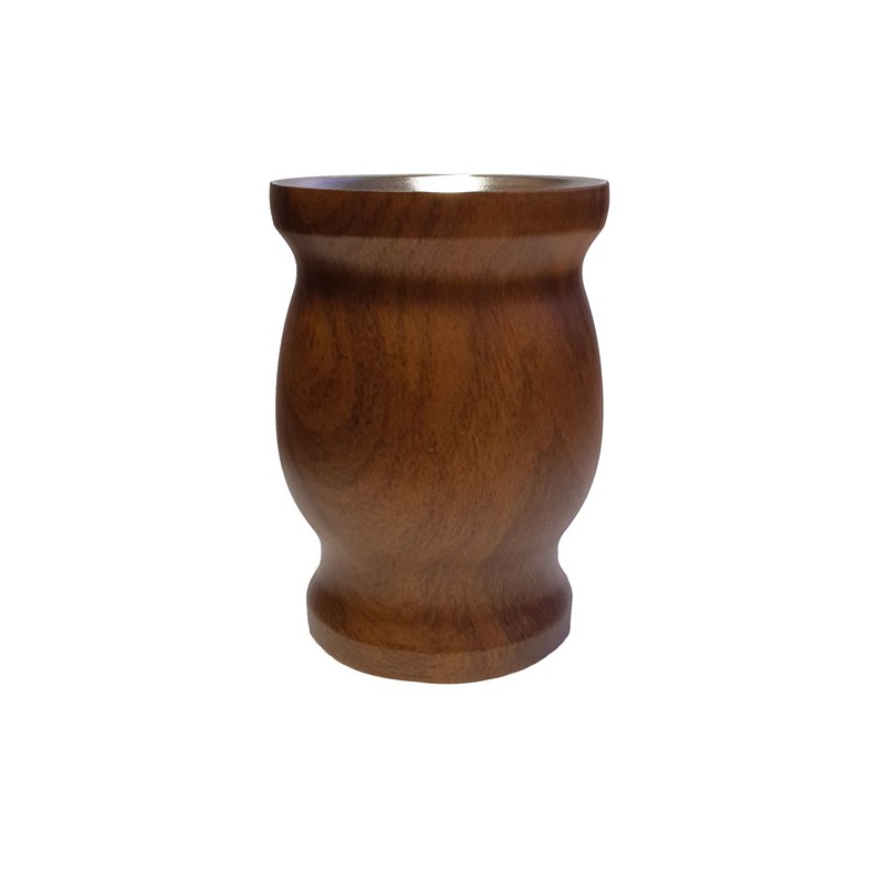 Mate aus Edelstahl mit brauner holzähnlicher Verzierung.