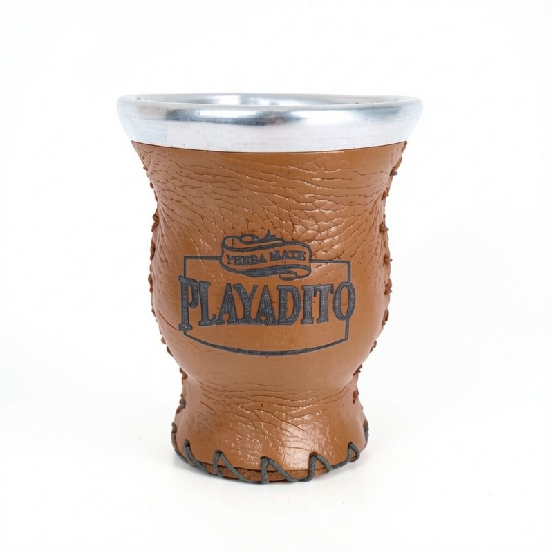 Magnifique maté en verre et recouvert de cuir véritable, à l’effigie de la marque Playadito. L’anneau métallique en haut est en aluminium.