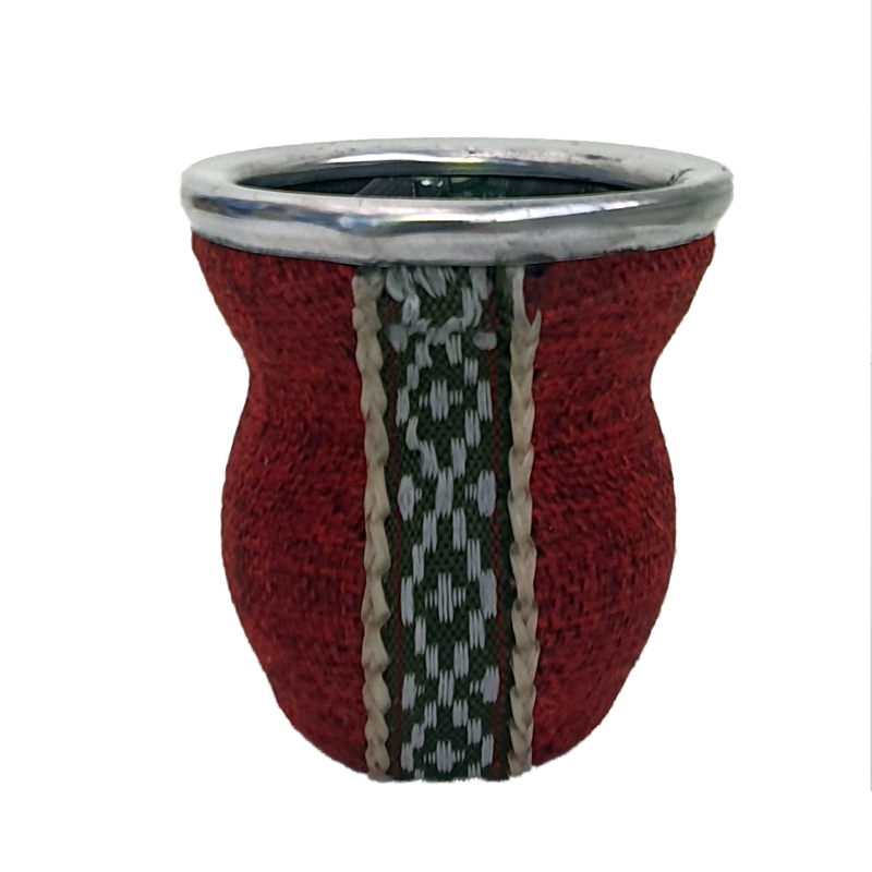 Bellissimo matè di vetro, rivestito in tessuto e con una fascia decorativa con motivo pampa. Un anello di alluminio circonda l'ampia apertura del matè. Diversi colori tra cui scegliere.