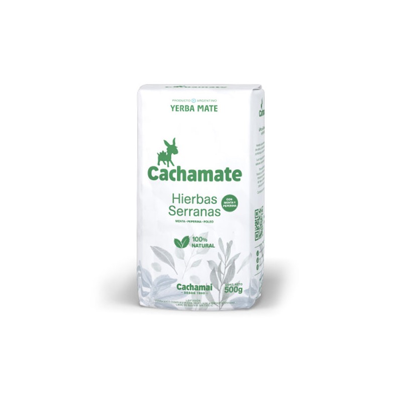 Cachamate Hierbas Serranas è una miscela di yerba e di erbe originarie delle zone montagnose. Il gusto è piacevolmente fresco e dolce. Per questa miscela, vengono usate diversi tipi di menta. La menta puleggio possiede, in più del suo gusto dolce, delle proprietà digestive usate da molto tempo in Argentina.